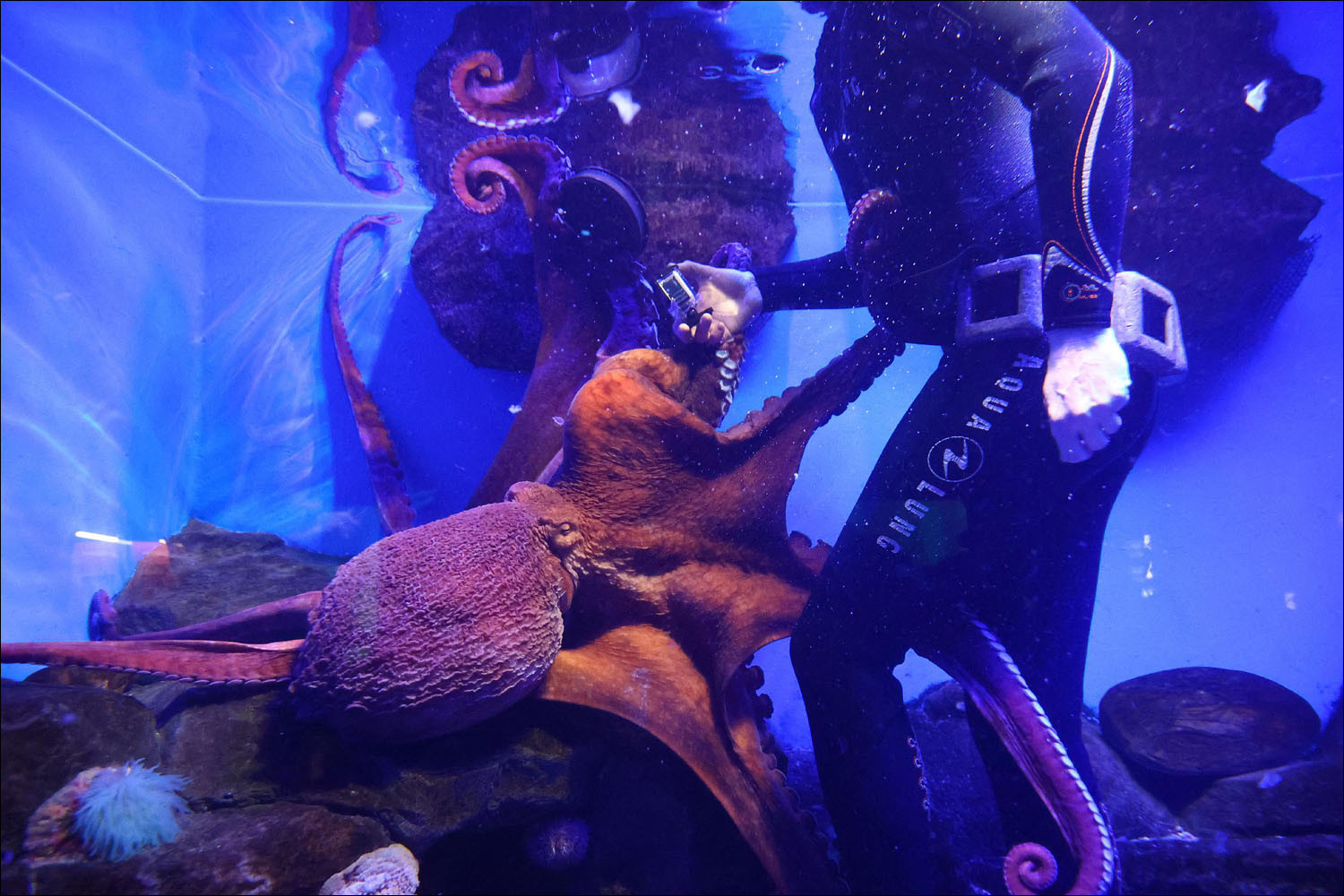 Also at Moskvarium, 3 times a week they play with the diver. They interact very actively: the diver doesn't just hand over food — you have to take it by force. Initially the octopus figures out that it's convenient to pull off certain parts of the diver, and apparently the diver doesn't mind much. It loves to confiscate all equipment. Everything gets taken, felt up, studied. There's a funny reaction when you take away the breathing tube — lots of bubbles, cool, but for some reason the diver immediately stops playing. Some dive without it, which triggers a desire to feel up the face and express bewilderment. It fairly quickly stops perceiving humans as a threat and begins to distinguish between divers. It treats different divers and biologists differently.