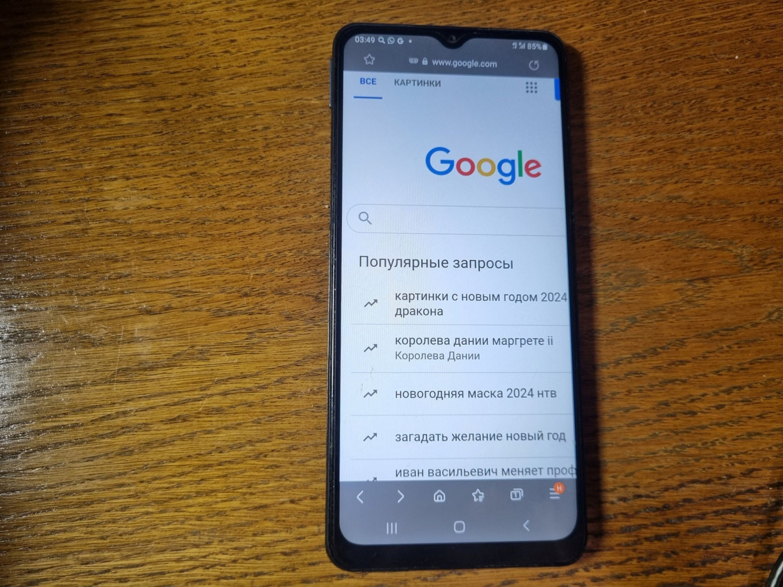 Samsung Galaxy M12 — a newer device, though missing its back cover and with a broken button.