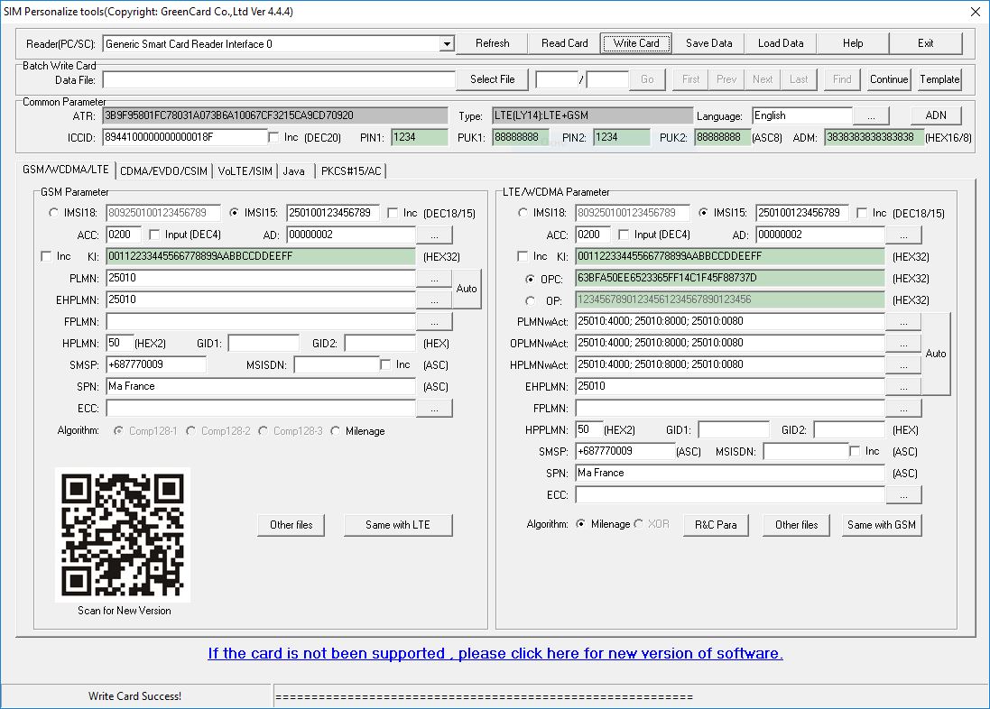 After filling in all parameters in the GSM section, click "Same with LTE" to copy them to the LTE section, then click "Write Card." Once the process completes, the card is ready for use.