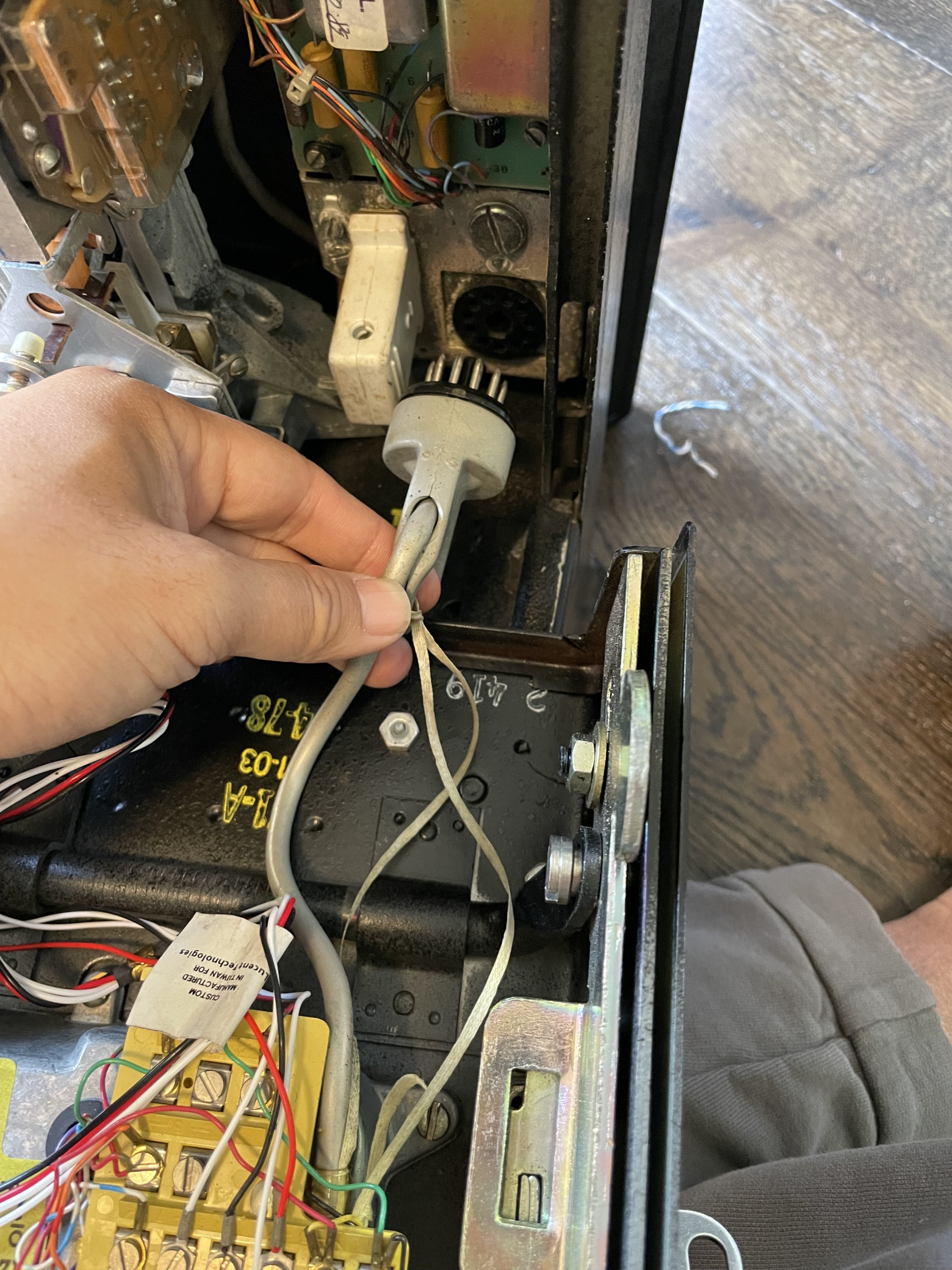 I'd never opened a payphone before, but the seller had sent keys and a barrel key along with it; all I had to do was turn the key and carefully remove the front panel. It wouldn't budge, so I had to disconnect a plug that apparently connected the front panel electronics to the payphone internals: