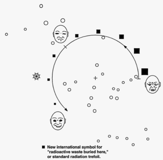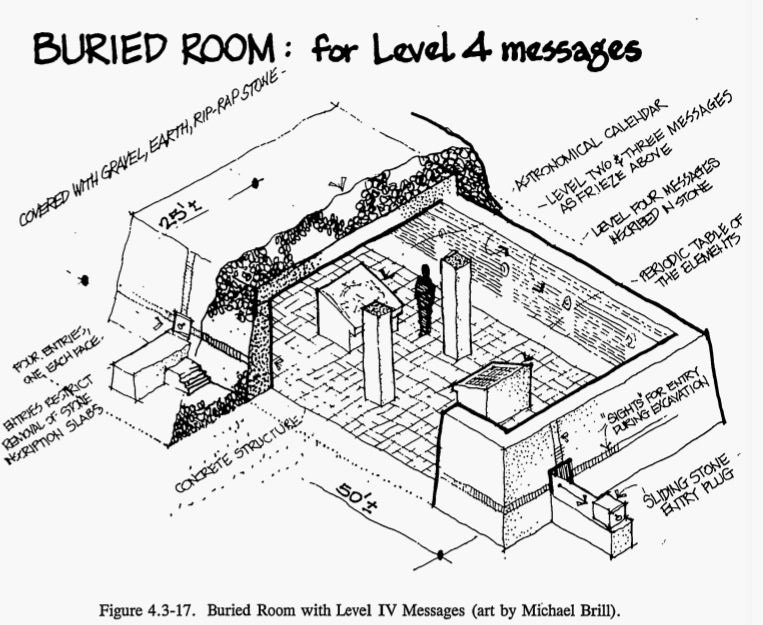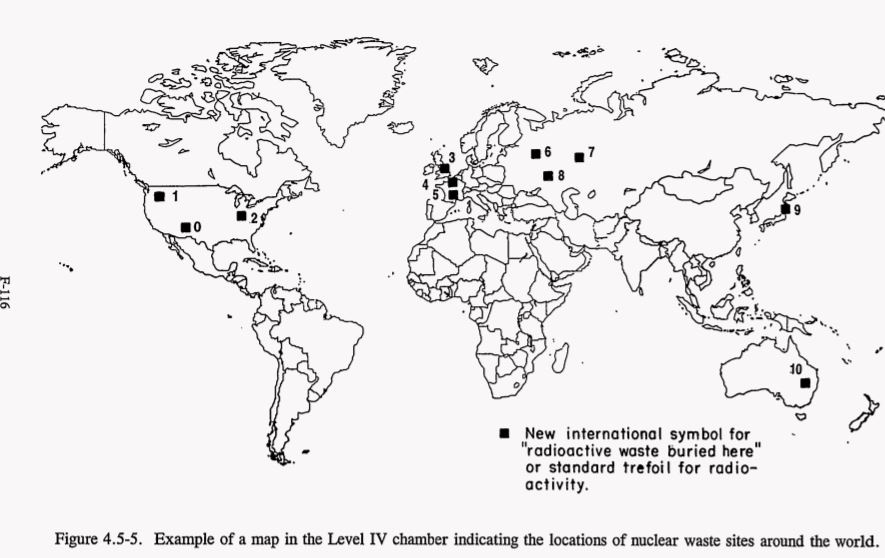 - Level III: Basic information answering what is buried here, where exactly, and why it is dangerous. Inscribed on granite monoliths in multiple languages and pictographic systems.