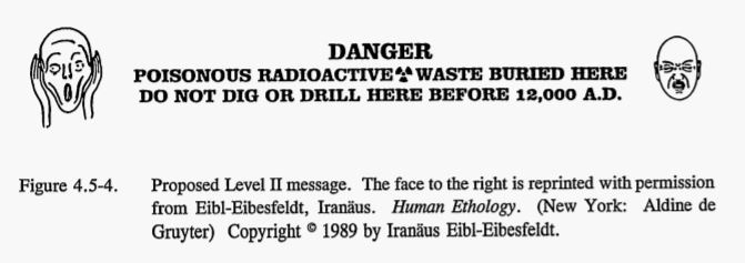 American researchers at Sandia National Laboratories tackled this problem in the 1990s for the Waste Isolation Pilot Plant (WIPP) in New Mexico. They developed what they called a "gestalt message" — a system designed to communicate danger across all possible levels of comprehension.