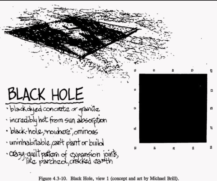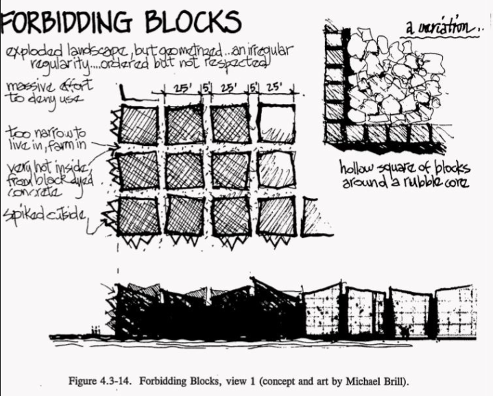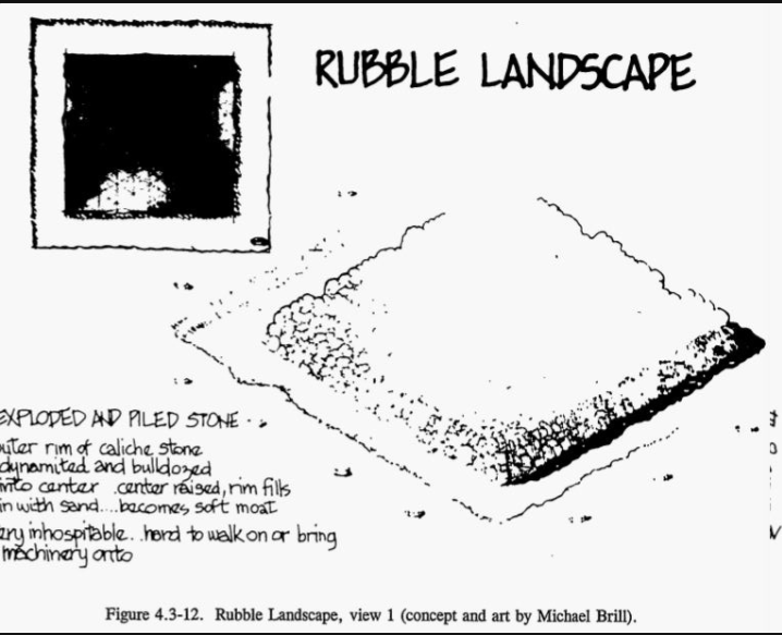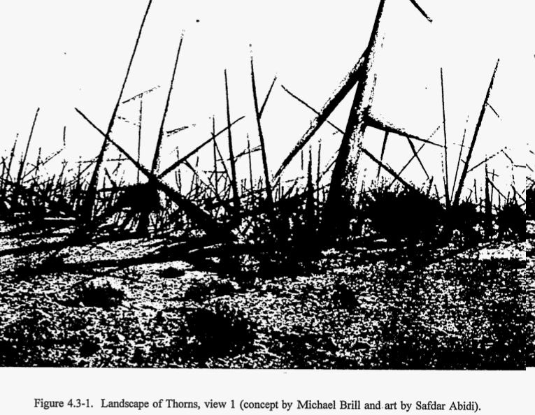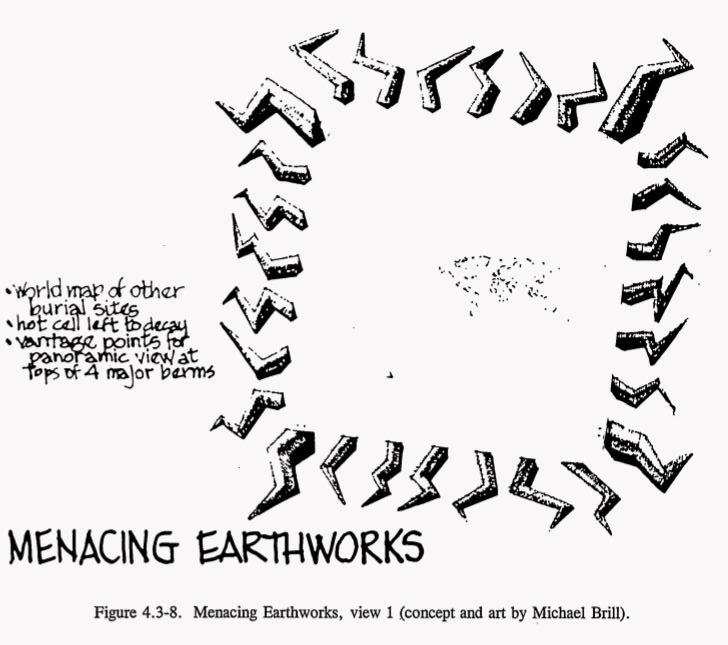 For Level II, the Sandia team proposed some truly remarkable designs. One concept featured a field of enormous concrete spikes, 25 feet tall, jutting from the earth at aggressive angles. The intent was purely emotional — the landscape should feel deeply wrong, hostile, unwelcoming. No rational analysis required, just primal aversion.