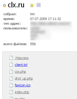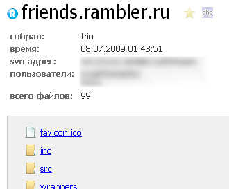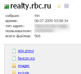 By accessing example.ru/.svn/entries, you can view the root file structure of the project along with authorship and modification history.