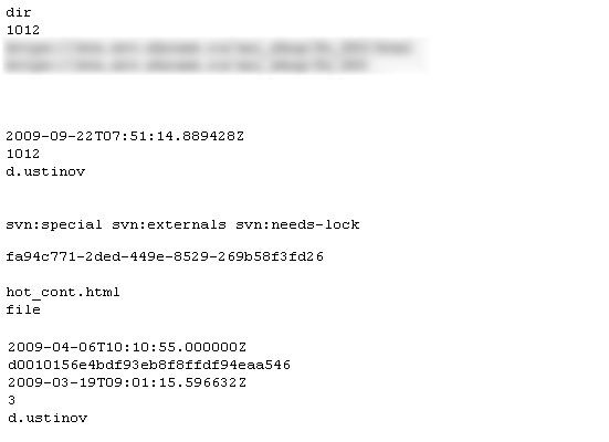 SVN (Subversion) stores its metadata files in a hidden .svn directory within each project folder. The most interesting file in this directory is called entries. It contains a list of all files and directories in the project, the repository location, file sizes, modification dates, and the usernames of the developers who modified them.