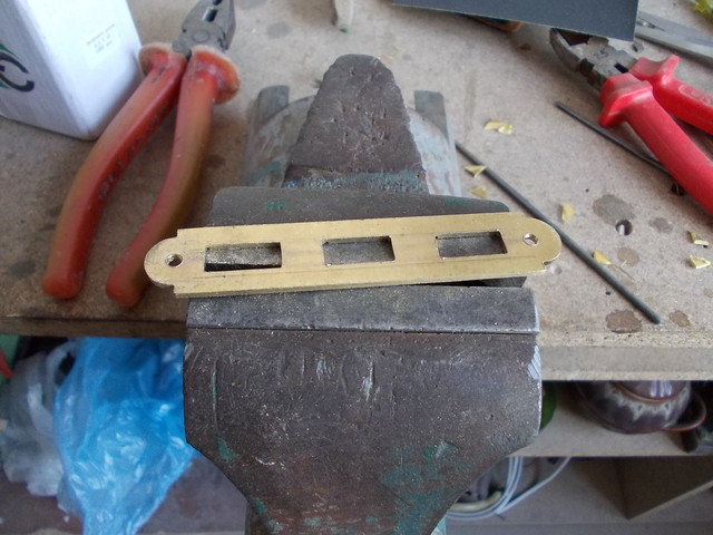 As for the keys themselves, I had the option of making them from buttons, but I decided that wouldn't be authentic enough. So the round keys were turned from brass rod, and the elongated ones were forged from brass plate.