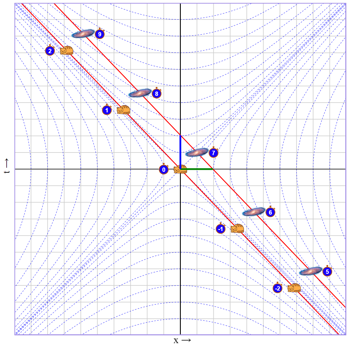 Strange. It seems everything looks the same as it was originally. Something's not right here. Let's try squishing the diagram horizontally again so that the grid measures light-seconds and we can see the light-speed cats.