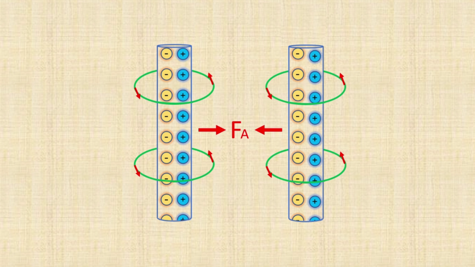 Let's take two wires, place them in parallel, and run current through them in the same direction. In this situation they begin to attract each other. Previously this was explained by the fact that moving electrons in the wire create magnetic fields that interact, creating the Ampere force that pulls the wires toward each other. Or pushes them apart if the currents flow in opposite directions.