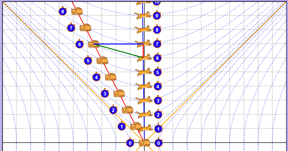 We are stationary relative to the sleeping cat, so for us the hyperbolas and straight lines are at the same height. His clock ticks normally. But the running cat crosses the hyperbolas less frequently than the horizontal lines. So when our clock has ticked 6 seconds, the running cat's has ticked less than five. It turns out that for us, time for the running cat runs slowly, but he himself doesn't notice it.
