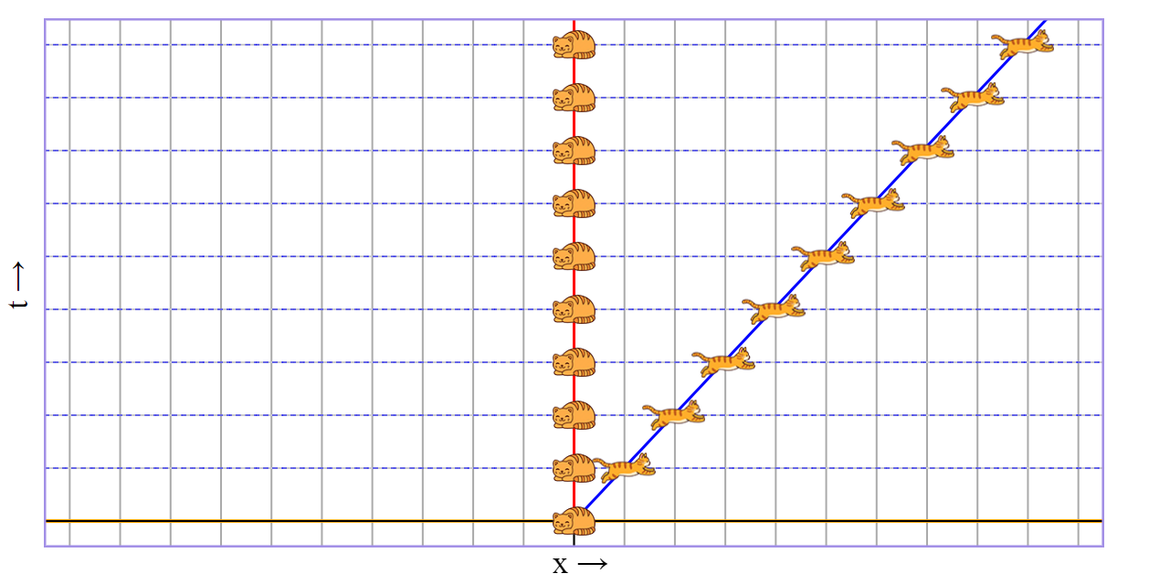Let's take two cats that we'll begin observing at the zero moment of time. One of them is sleeping. He is stationary relative to us, so his worldline is simply a vertical straight line.