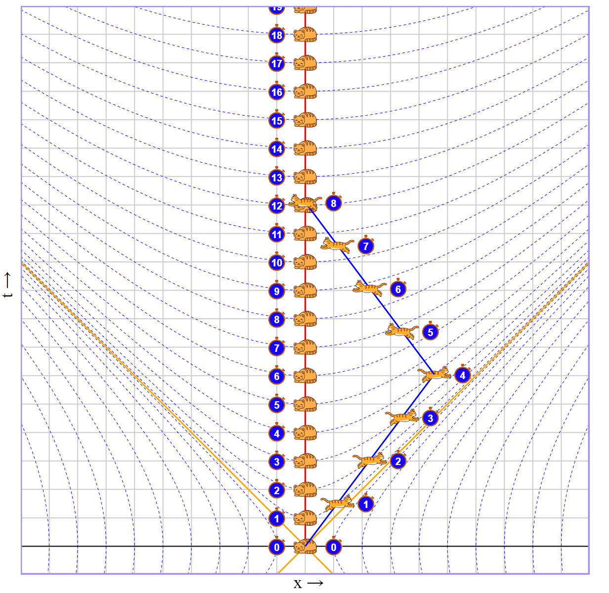 To illustrate the effect of time dilation, let's give our cats clocks and look at the diagram once more.