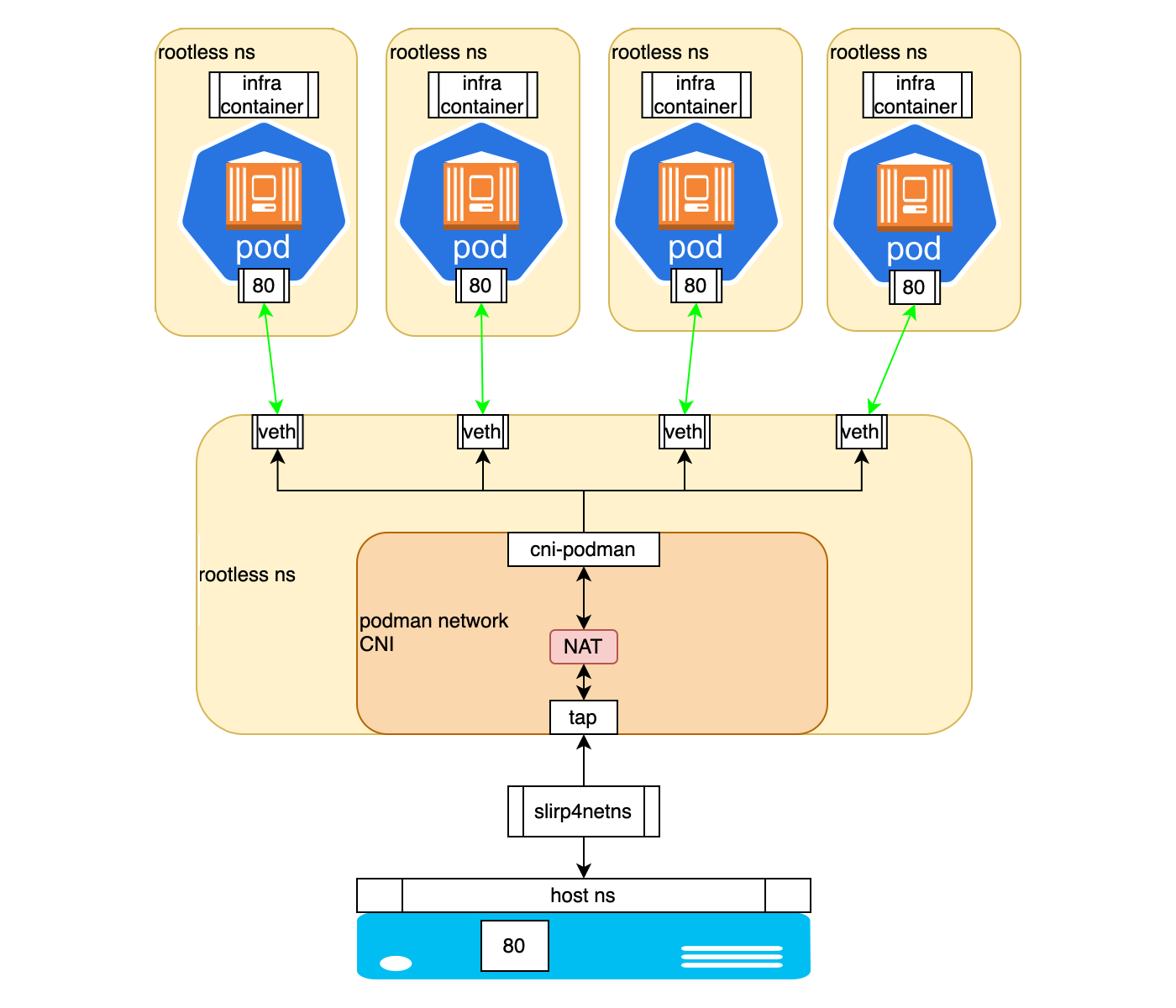 Thus, this configuration strikes a balance between isolation (separate namespaces) and connectivity (shared virtual network). Each pod is isolated, but they are all connected to the same virtual network, served by a single slirp4netns process.