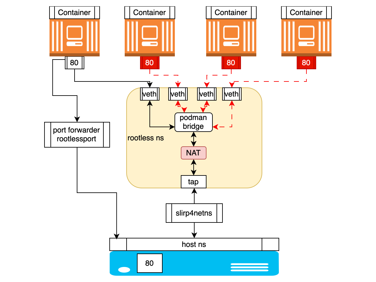 While deploying a couple dozen containers in Podman in rootless mode, we suddenly discovered that they could not use the same ports at the same time, as it usually works when using Docker. There are several solutions, but within the imposed restrictions, standard options were not