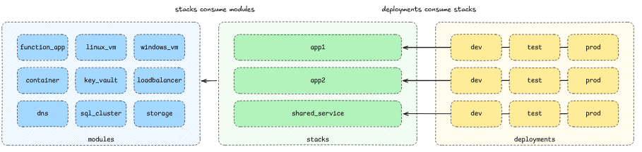 terraform/ ├── modules/ │ ├── app_service/ │ ├── sql_database/ │ ├── storage_account/ │ ├── virtual_network/ │ └── key_vault/ ├── stacks/ │ ├── app1/ │ └── app2/ │ └── shared_service/ ├── deployments/ │ ├── app1/ │ │ ├── dev/ │ │ ├── test/ │ │ └── prod/ │ └── app2/ │ ├── dev/ │ ├── test/ │ └── prod/ │ └── shared_service/ │ ├── dev/ │ ├── test/ │ └── prod/