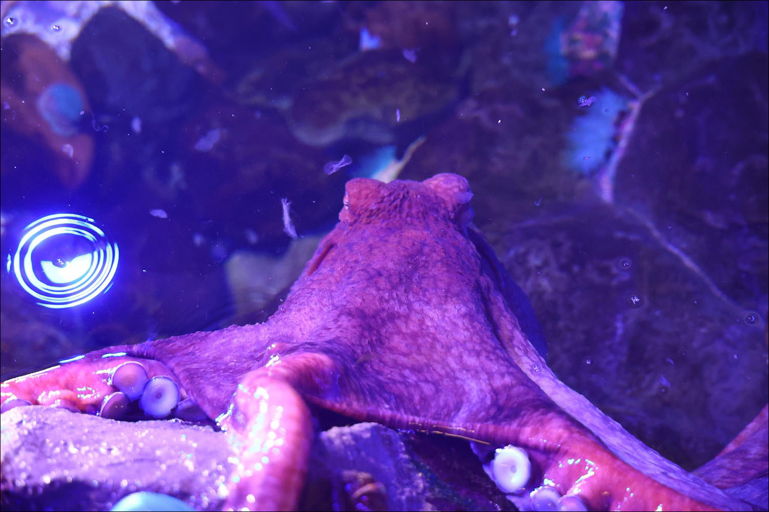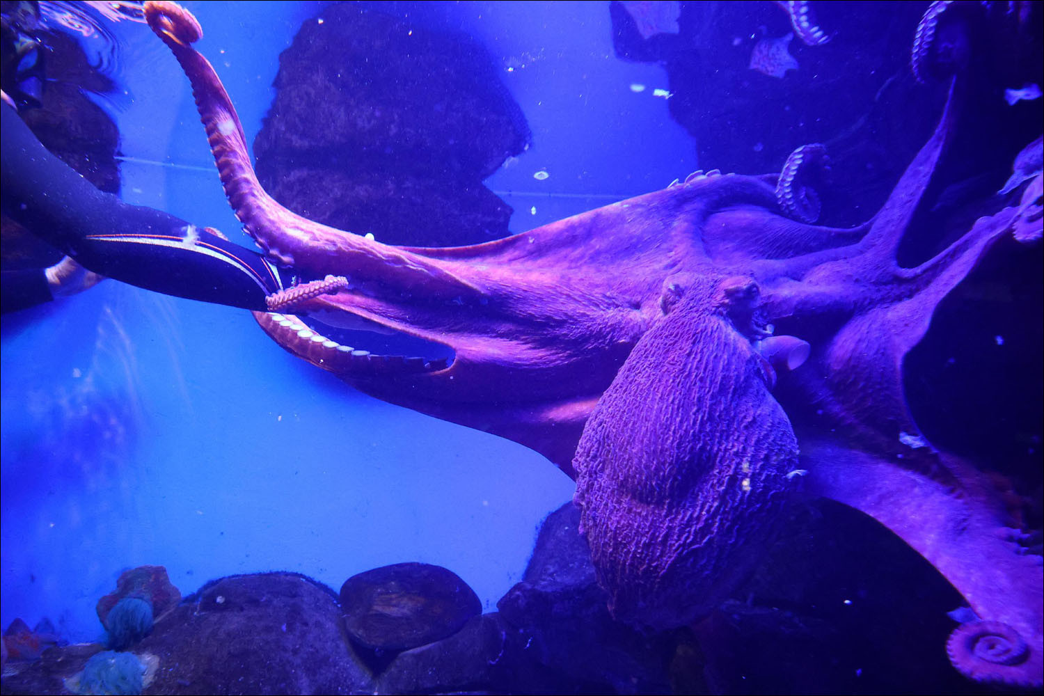 Also at Moskvarium, 3 times a week they play with the diver. They interact very actively: the diver doesn't just hand over food — you have to take it by force. Initially the octopus figures out that it's convenient to pull off certain parts of the diver, and apparently the diver doesn't mind much. It loves to confiscate all equipment. Everything gets taken, felt up, studied. There's a funny reaction when you take away the breathing tube — lots of bubbles, cool, but for some reason the diver immediately stops playing. Some dive without it, which triggers a desire to feel up the face and express bewilderment. It fairly quickly stops perceiving humans as a threat and begins to distinguish between divers. It treats different divers and biologists differently.