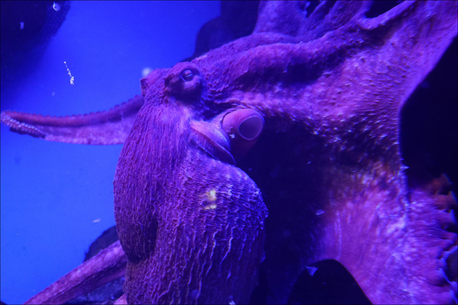 As a home, the octopus uses practically any cavity of sufficiently small size, squeezes in there and sits comfortably like a cat in a jar. It can block the entrance with rocks to a comfortable size and generally renovate to taste. If there's no suitable cavity available — it can bring one. There's a species that carries its shelter around, for example, a coconut half (that's Amphioctopus marginatus). Almost like a snail, except it can drop it, do something nearby, carry it further. Basically, a tourist with an armored tent. For doflein's octopuses, there's reliable correlation in captivity — if there's no shelter or niche to hide in, stress sets in significantly faster and lifespan is cut roughly in half. At Moskvarium there are two shelters right away: a large cave and a slightly smaller one. You can choose and take twice as long to clean up.