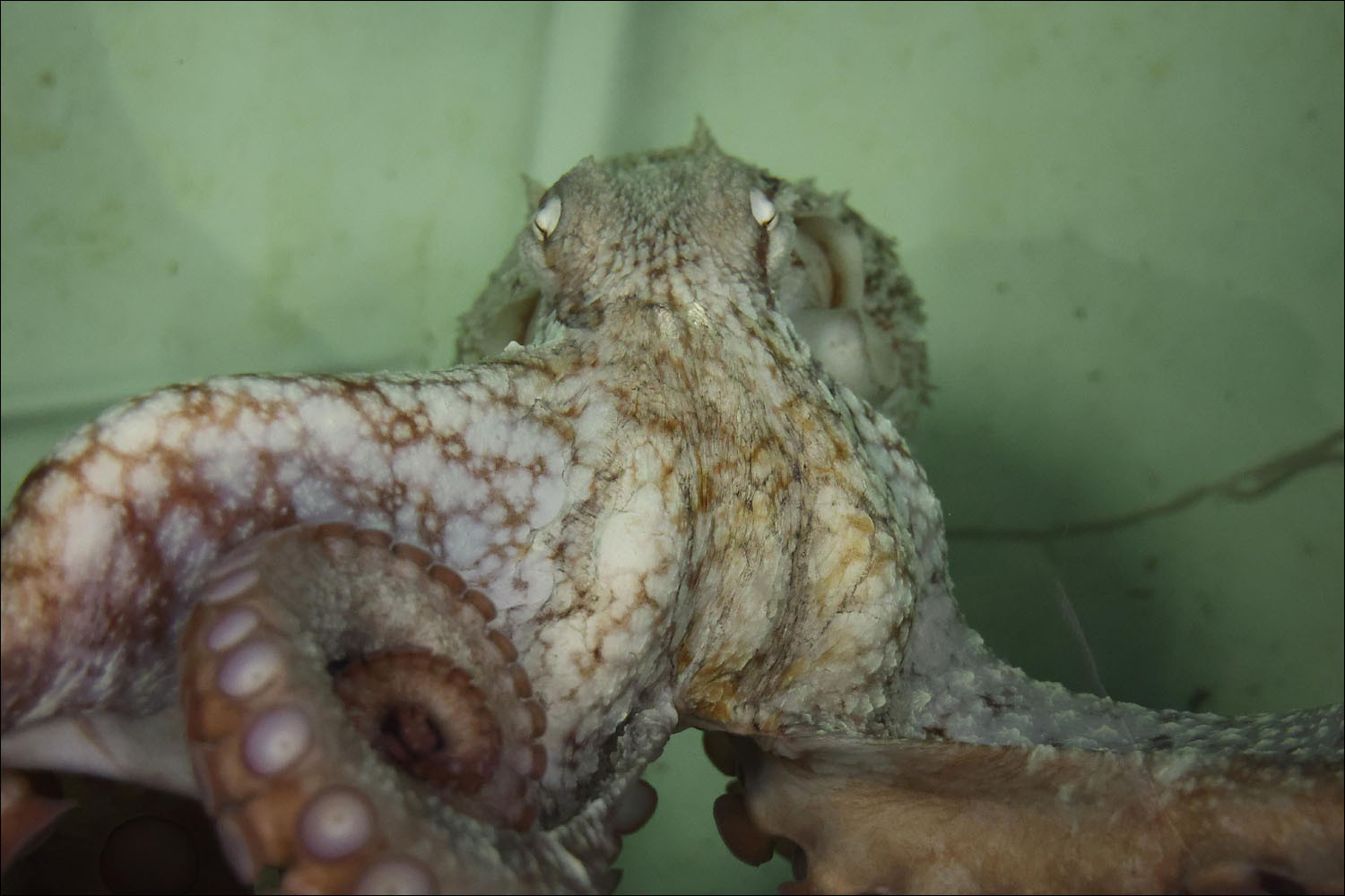 Octopuses also express emotions through color. For example, here's a white octopus from Moskvarium — it's currently thinking: