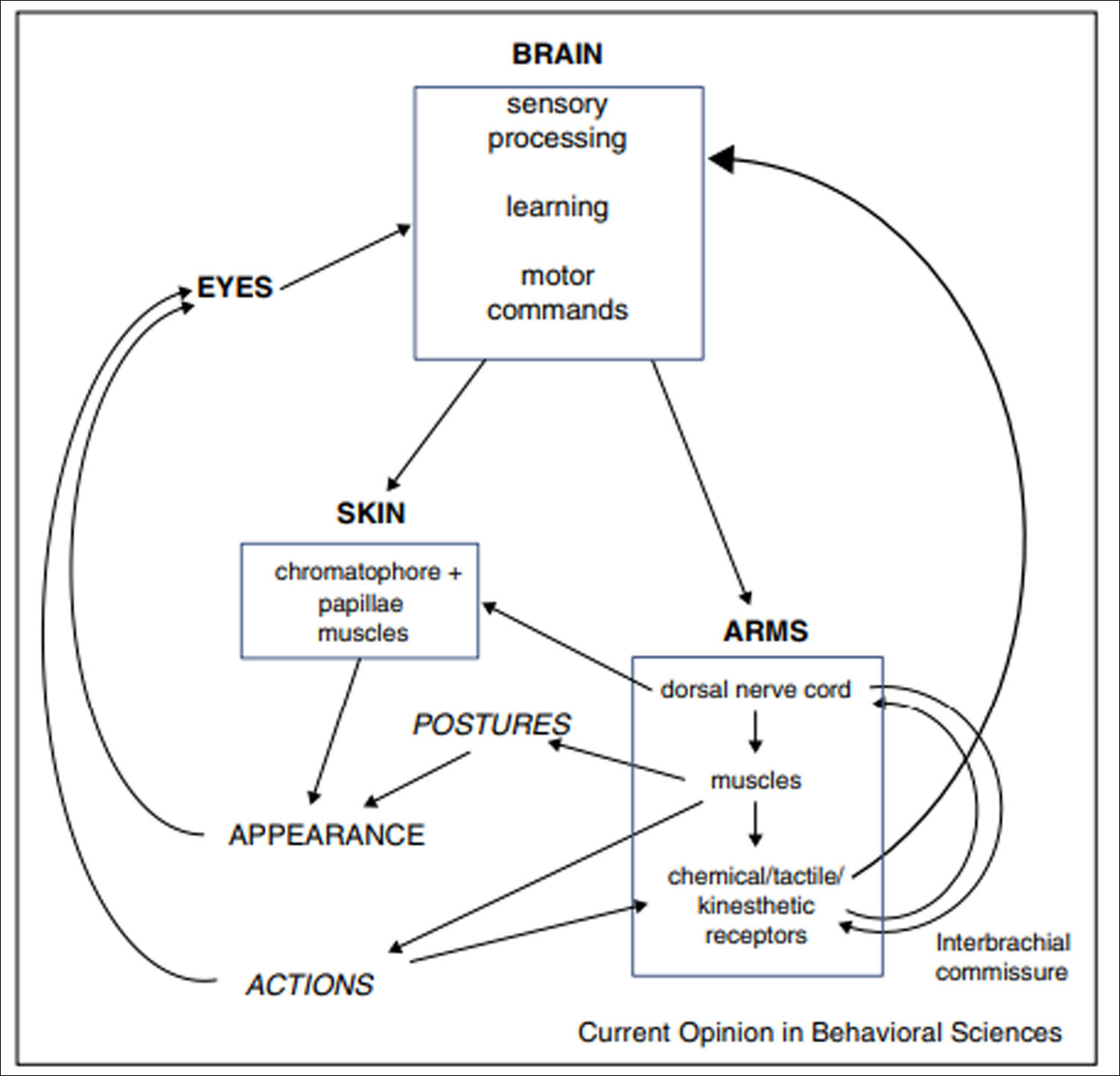 "The chromatophore-based skin appearance system is probably an open loop and inaccessible to the octopus's vision. In contrast, under laboratory conditions that are not ecologically appropriate for the octopus, learning of shapes and extent of visual figures was extensive and flexible, probably consciously planned. Similarly, the local location of octopuses in space and navigation through it may be determined by the plane of light polarization and the arrangement of visual landmarks; they are learned and controlled."