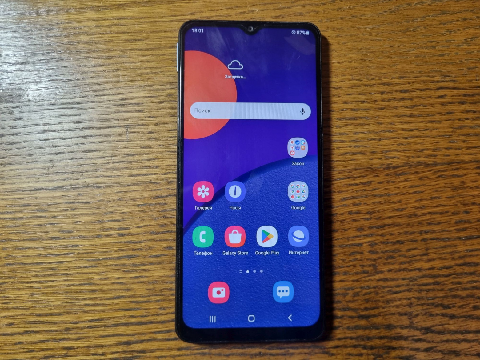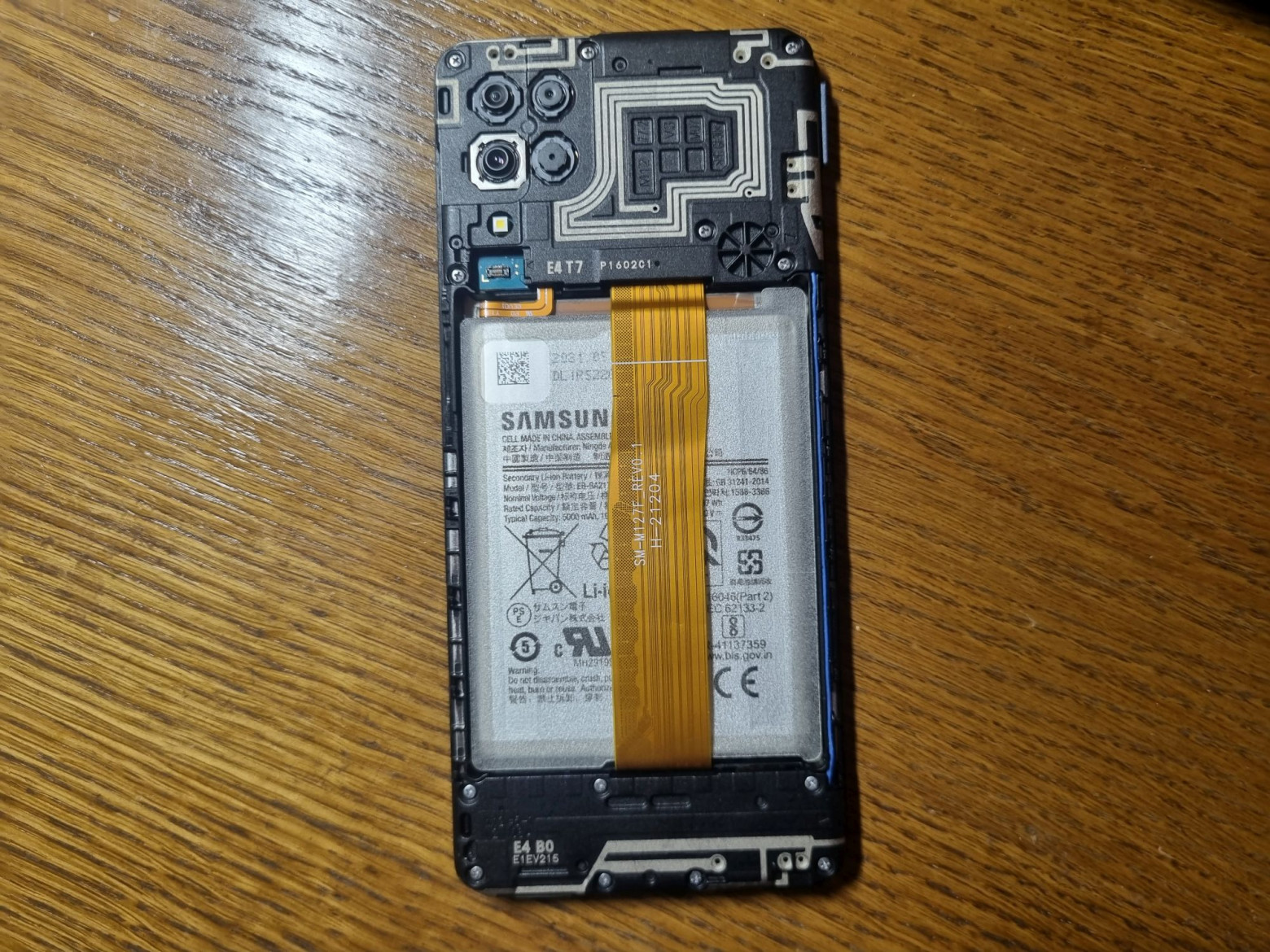 Samsung Galaxy M12 — a newer device, though missing its back cover and with a broken button.