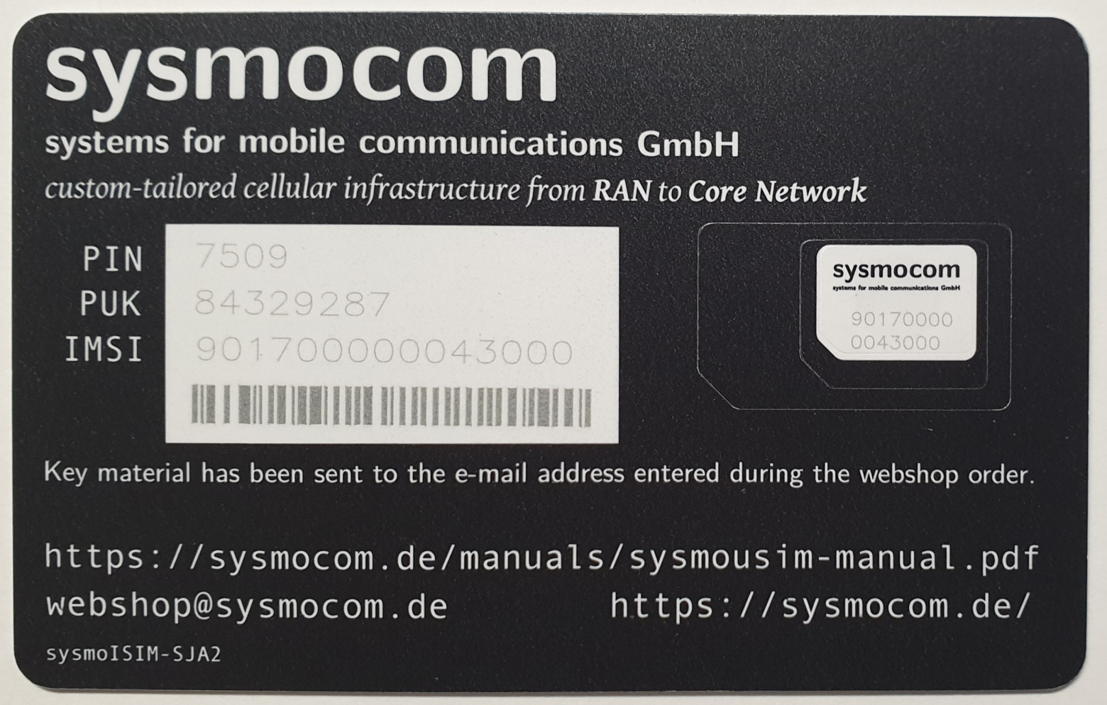 Sysmocom cards — expensive, hard to obtain, but with the best stability and production-grade quality. They come with fixed IMSI values and pre-loaded keys emailed to you after purchase.