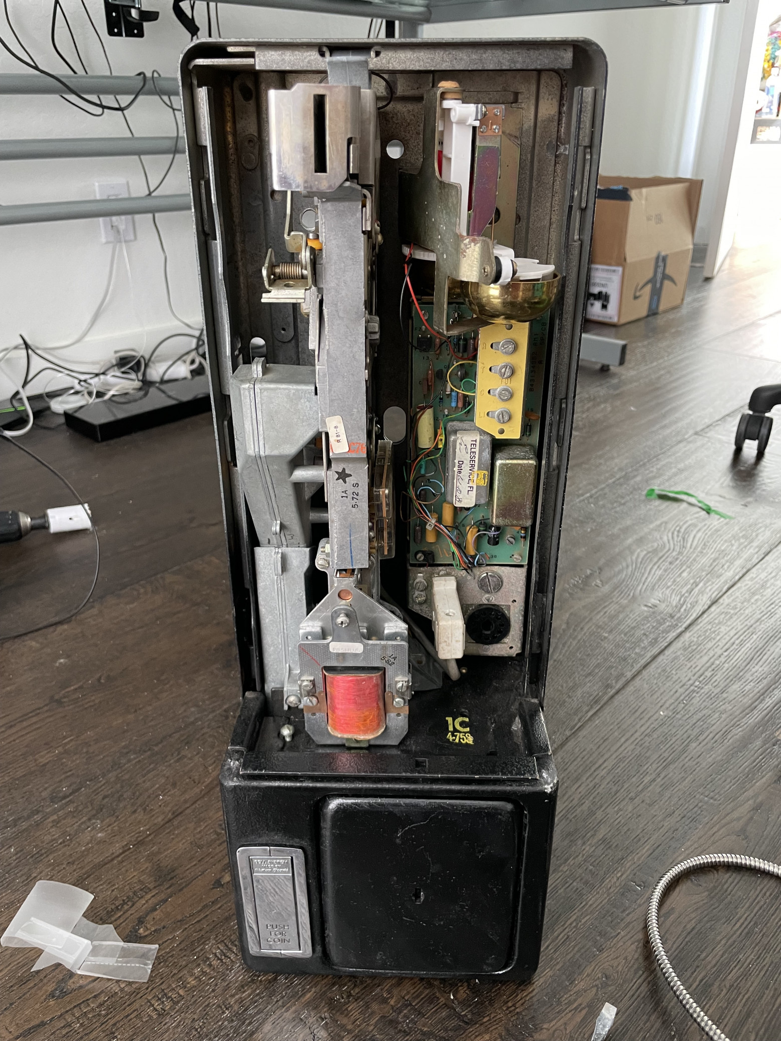I'd never opened a payphone before, but the seller had sent keys and a barrel key along with it; all I had to do was turn the key and carefully remove the front panel. It wouldn't budge, so I had to disconnect a plug that apparently connected the front panel electronics to the payphone internals: