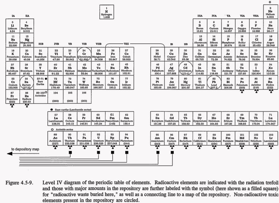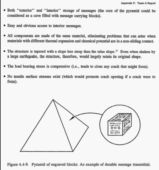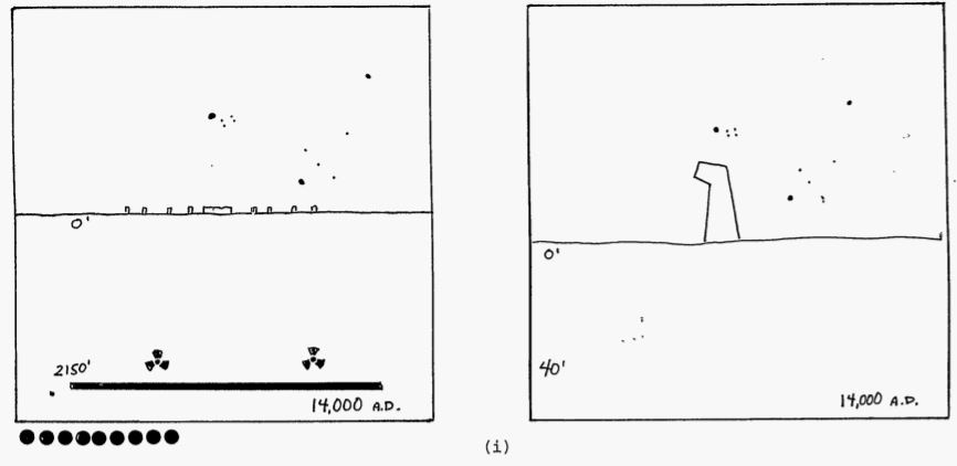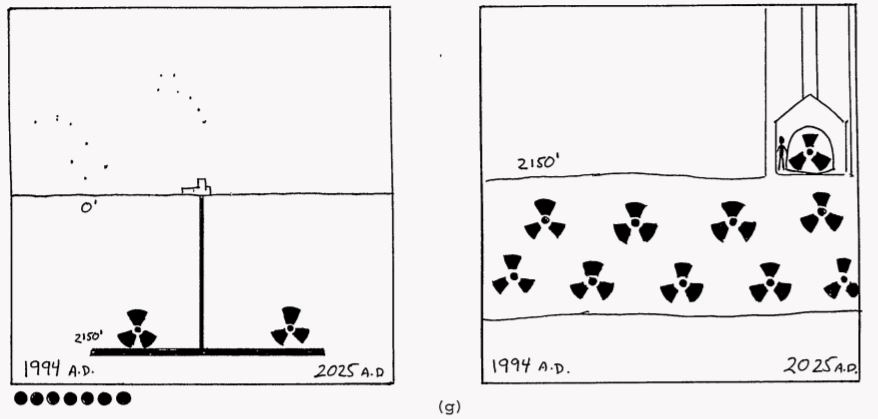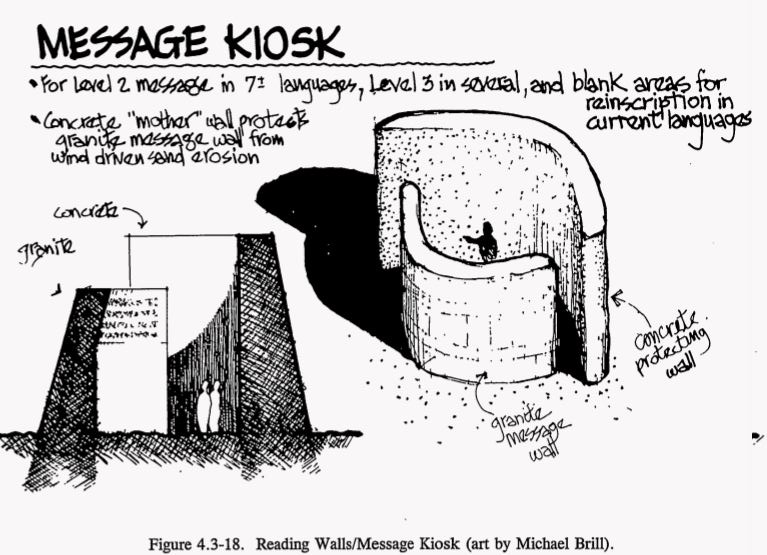 - Level III: Basic information answering what is buried here, where exactly, and why it is dangerous. Inscribed on granite monoliths in multiple languages and pictographic systems.