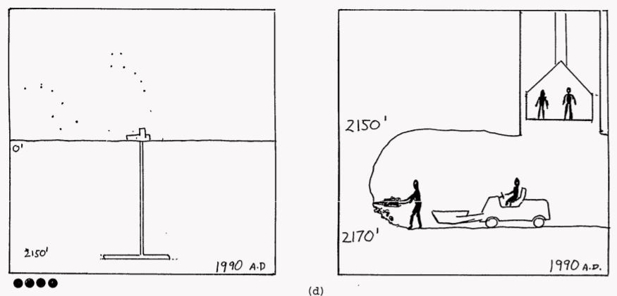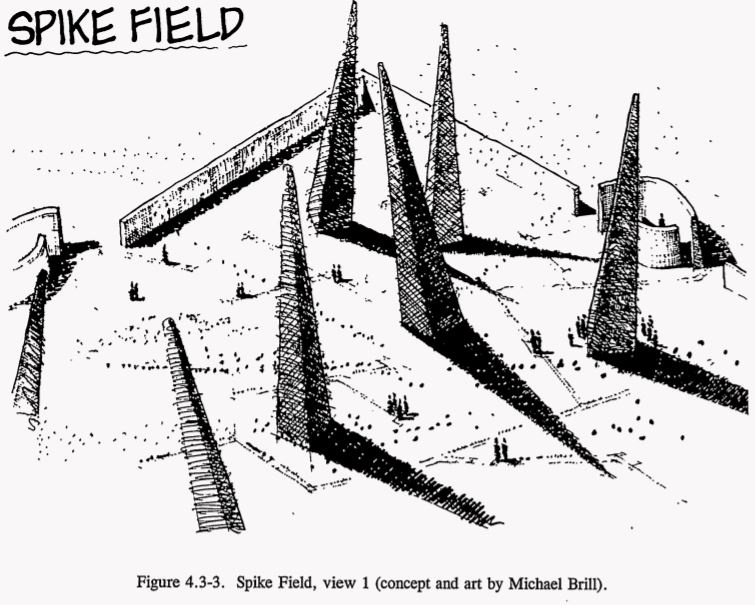 For Level II, the Sandia team proposed some truly remarkable designs. One concept featured a field of enormous concrete spikes, 25 feet tall, jutting from the earth at aggressive angles. The intent was purely emotional — the landscape should feel deeply wrong, hostile, unwelcoming. No rational analysis required, just primal aversion.