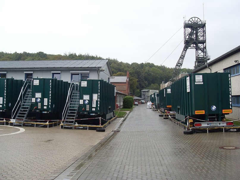 The Germans took a different path. Coincidence or not, but on both sides of the Berlin Wall, radioactive waste was disposed of identically — dumped into old mines. Over two world wars, German industry had completely gnawed out certain deposits of salt and potash, forming a number of huge and utterly useless holes. Throw the spent uranium in there — and you're golden, right? At first, yes. Then a certain disaster begins — by the forces of the underworld, the mines collapse, flood, and get pushed to the surface. What to do?! The contaminated water goes into other mines, the soil too, and if it's a total catastrophe — fill it in and pray it doesn't resurface. In short, pouring from empty into void, and there's no end to it to this day.