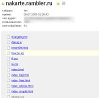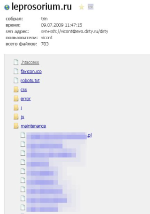 By accessing example.ru/.svn/entries, you can view the root file structure of the project along with authorship and modification history.