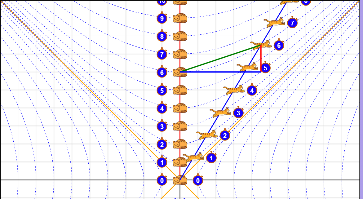 We are stationary relative to the sleeping cat, so for us the hyperbolas and straight lines are at the same height. His clock ticks normally. But the running cat crosses the hyperbolas less frequently than the horizontal lines. So when our clock has ticked 6 seconds, the running cat's has ticked less than five. It turns out that for us, time for the running cat runs slowly, but he himself doesn't notice it.