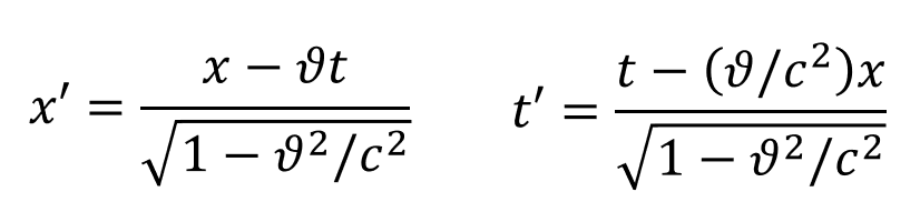 These are called Lorentz transformations. Instead of an angle, here we have the speed relative to the observer. By the way, from these formulas you can see that if you substitute zero speed relative to the observer or infinite speed of light, the denominators become one and the formulas turn into ordinary Galilean transformations.