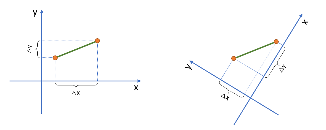 Importantly, distances between points don't change when the coordinate system is moved or rotated. No matter how we move or rotate our pair of axes relative to the pair of points, the distance computed by this formula won't change.