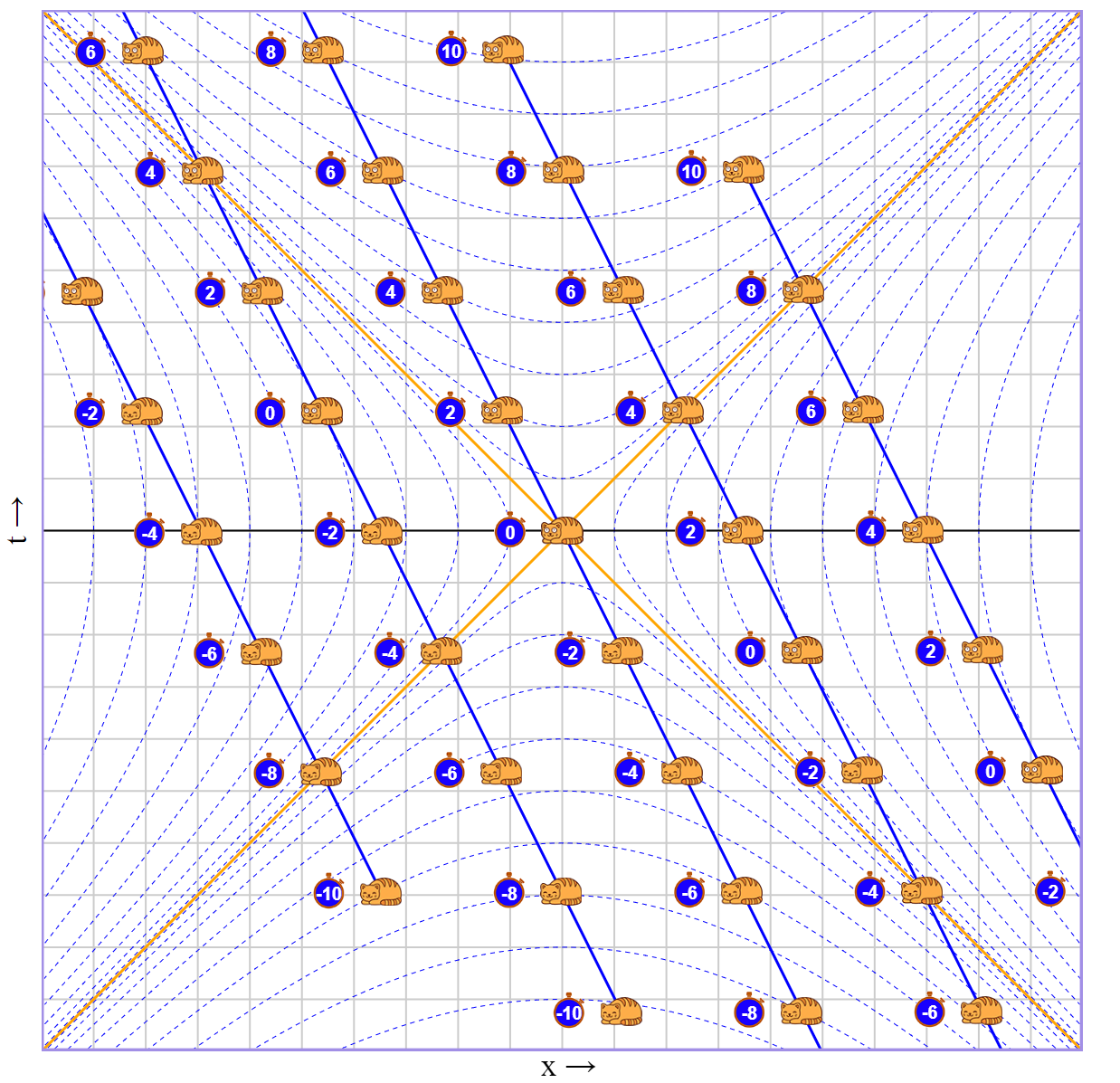 Strange. It seems everything looks the same as it was originally. Something's not right here. Let's try squishing the diagram horizontally again so that the grid measures light-seconds and we can see the light-speed cats.